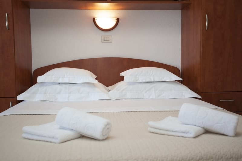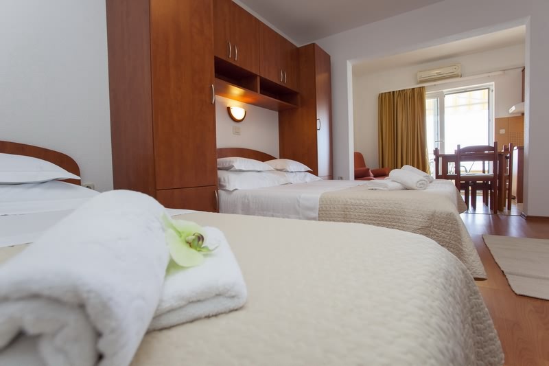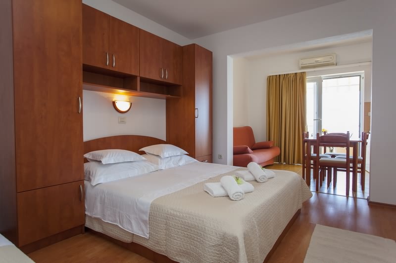Apartmán-studio, 35m2, je umístěn na druhém patře, a skládá se z jednoho pokoje ve kterém je manželská postel pro 2 osoby, lůžko pro 1 osobu + přistýlka 1-2 osob (gauč) , kuchyně, koupelna se sprchovým koutem, klimatizace, TV/SAT, free WI-FI, balkon z přední strany domu který má přímý výhled na moře, parkoviště na dvoře. V ceně je zahrnuta pobytová taxa, povlečení, ručníky i úklid apartmánu.