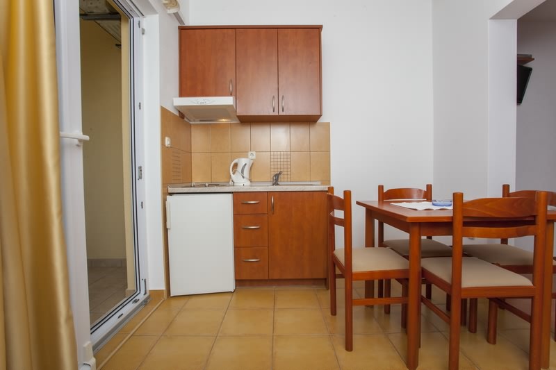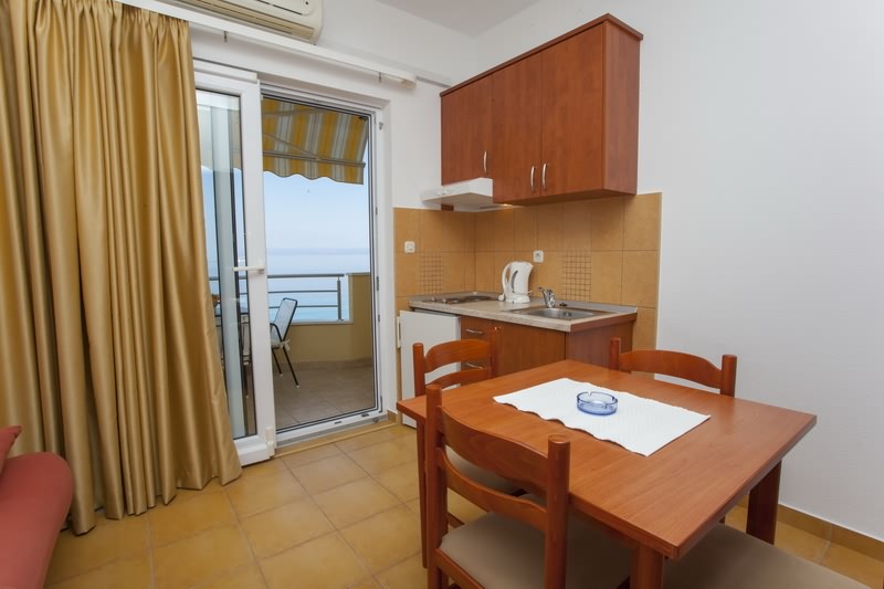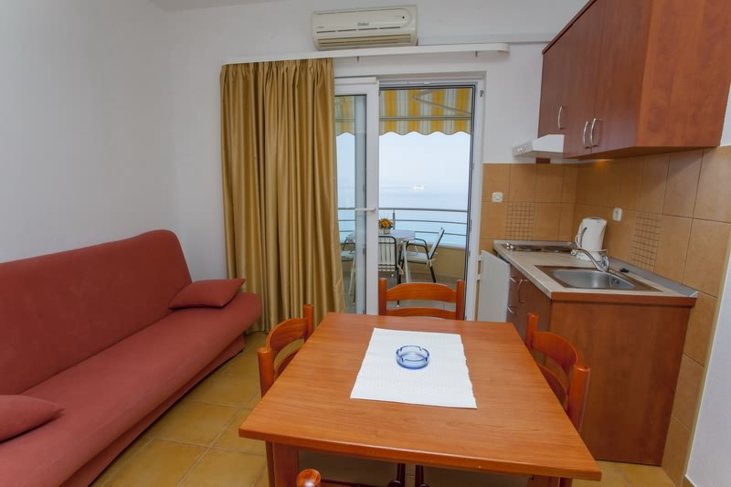 Apartman-studio, 35m2, je smješten na drugom katu kuće, a sastoji se od jedne sobe u kojoj je bračni krevet za dvoje , krevet za jednu osobu + pomoćni ležaj za 1-2 osobe (kauč) , kuhinje, kupaone s tuš kabinom, klimatizacije, TV/SAT, free WI-FI, balkon s prednje strane kuće koji ima direktan pogled na more, parking u dvorištu kuće. U ponudu je uključena boravišna pristojba, posteljina, ručnici i čišćenje apartmana.